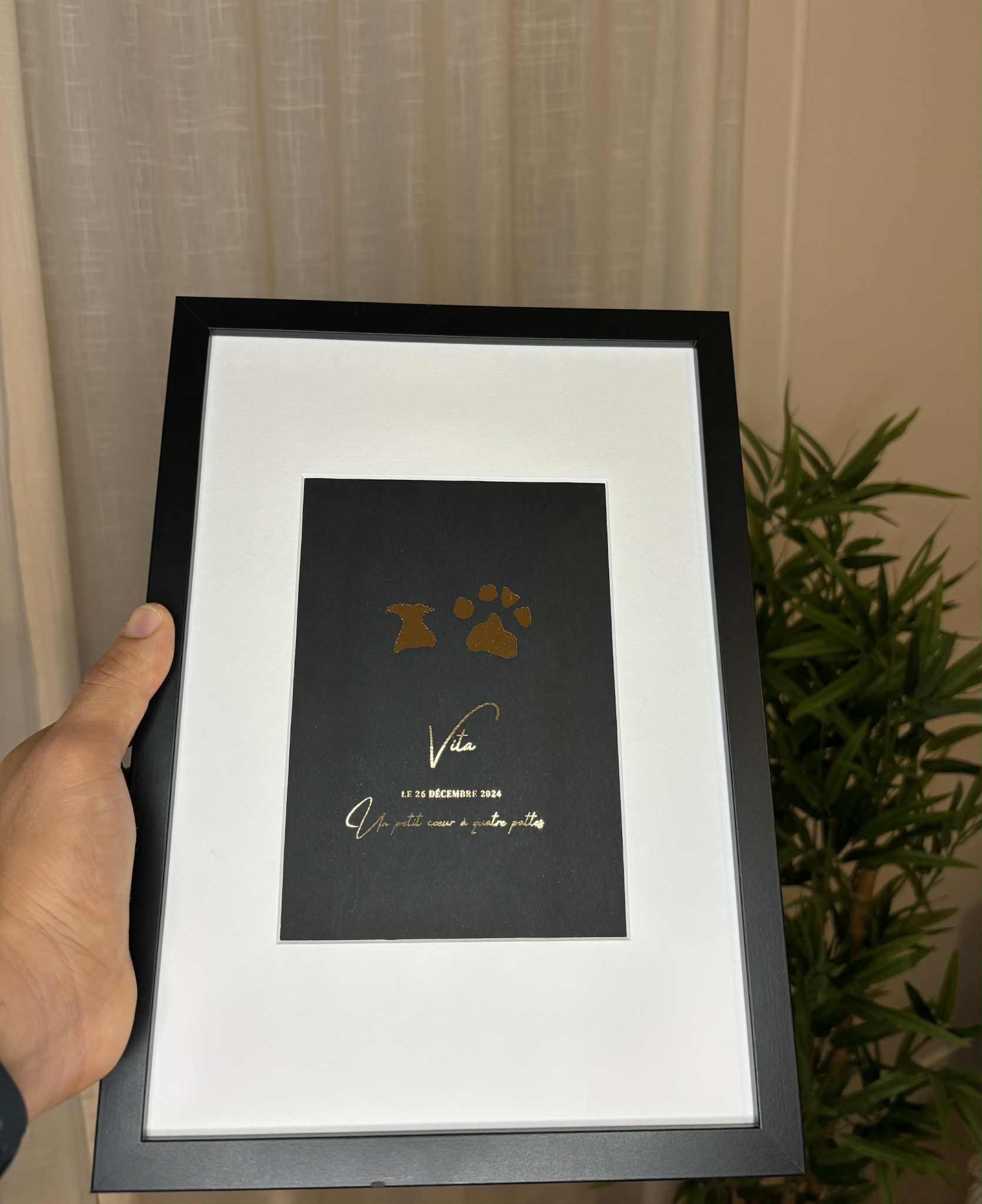 Ces cadres décoratifs s’intègrent parfaitement dans votre intérieur et constituent un cadeau idéal pour les amoureux des animaux. Chaque empreinte devient une pièce personnalisée, pleine d’attachement et de souvenirs à partager pour toujours.