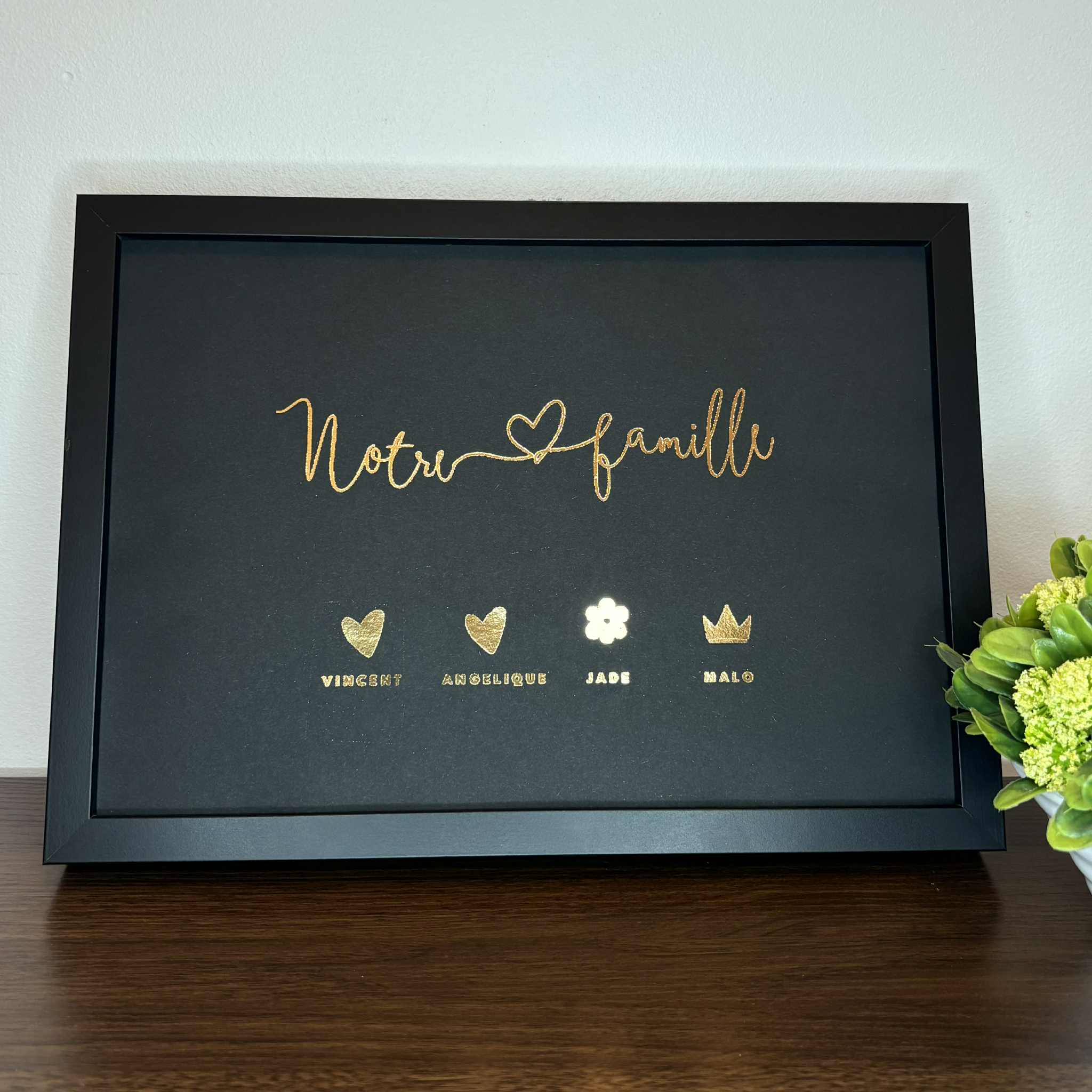 Célébrez les liens qui vous unissent grâce à nos tableaux personnalisés pour la famille. Chaque création met en valeur les prénoms, dates importantes ou symboles que vous choisissez, pour composer une décoration unique, chaleureuse et pleine de sens.